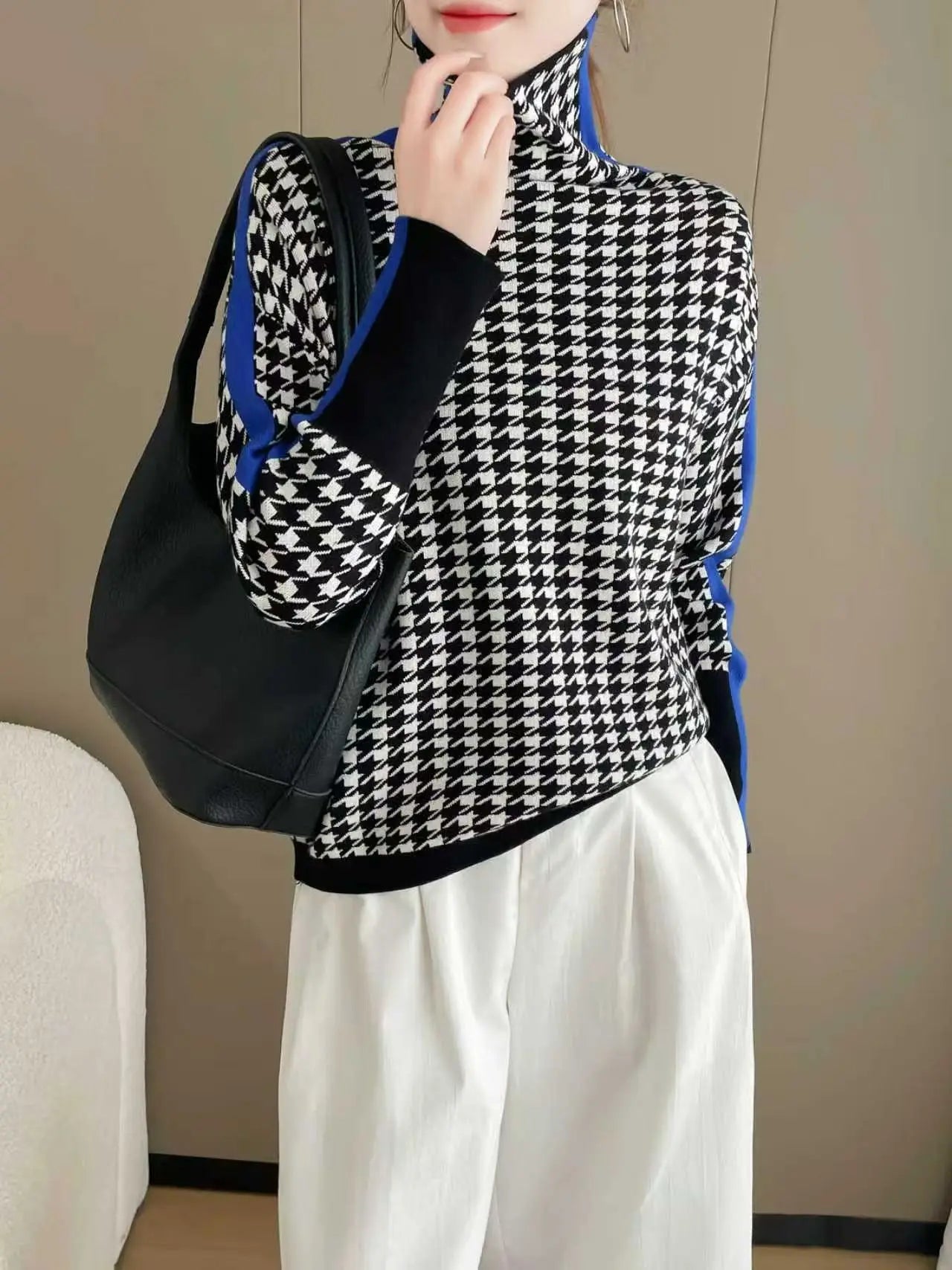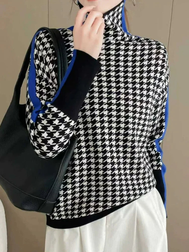 The Eliza™ | Turtleneck Sweater elevates your wardrobe with a sophisticated twist on a timeless pattern. This chic sweater features a bold houndstooth design complemented by vibrant color-blocked sleeves, offering an unexpected pop of contrast. Its high-neck collar provides warmth, while the relaxed fit ensures comfort throughout the day. Crafted from soft, breathable fabric, this sweater is ideal for both professional and casual occasions. Whether layered with your favorite blazer or worn on its own, this piece brings effortless elegance and contemporary flair.